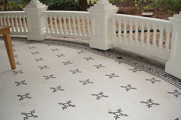 She discovered a small entrepreneur at American Restoration Tile in Arkansas who was able to make the porch floor’s field tiles in a snowflake design and the Greek key border. To prevent having hundreds of tiny pieces to install, Mozen created a CAD drawing for two layout patterns, one with the snowflake and one without.