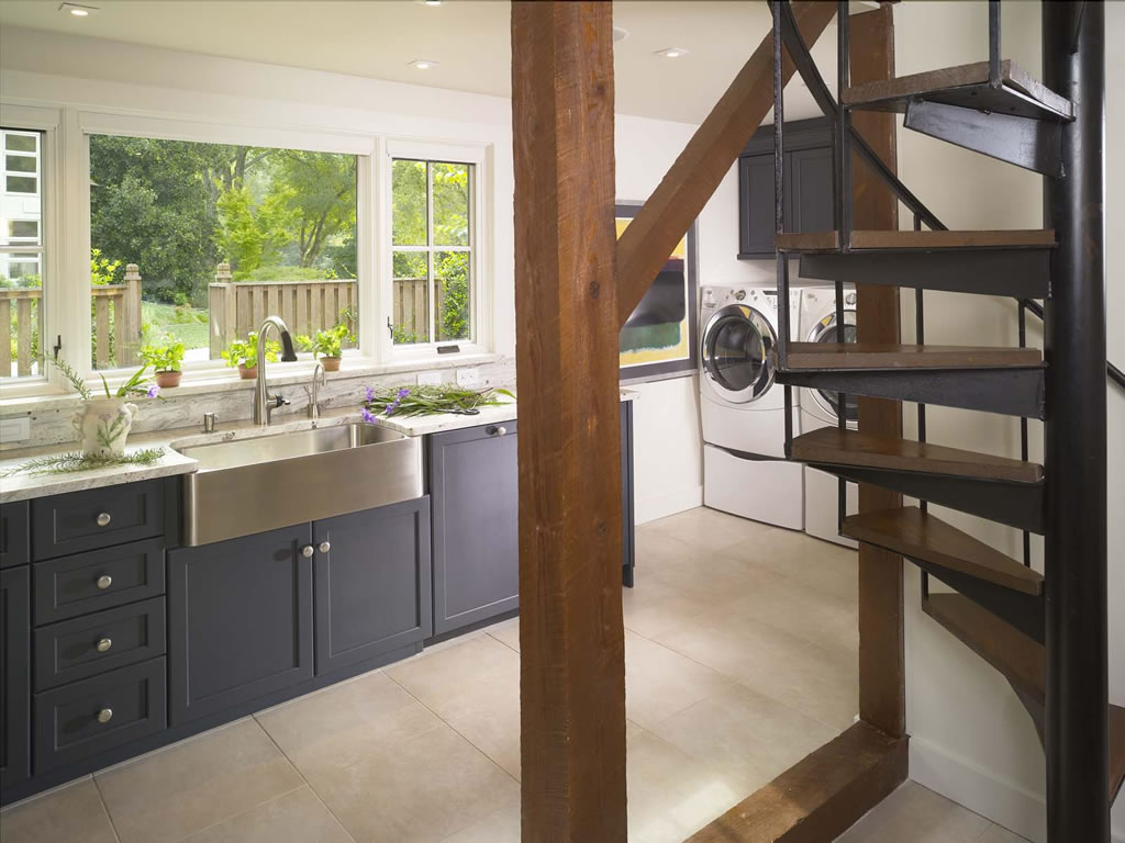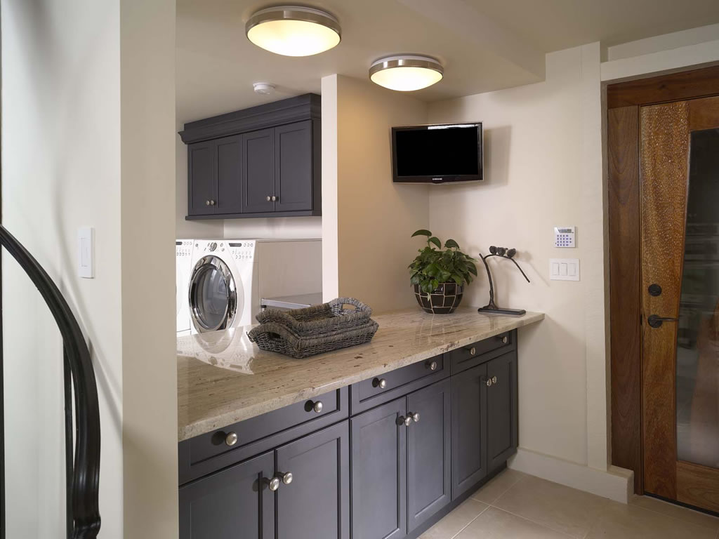 A small laundry was created to wash linens from the parties and towels from the spa (there is a larger laundry upstairs). The cabinets in the prep kitchen are painted a charcoal color to designate a different space and to complement the antique glaze finish of the butternut wooden cabinets in the main kitchen. With its stainless steel appliances and clean lines, this prep kitchen represents efficiency.