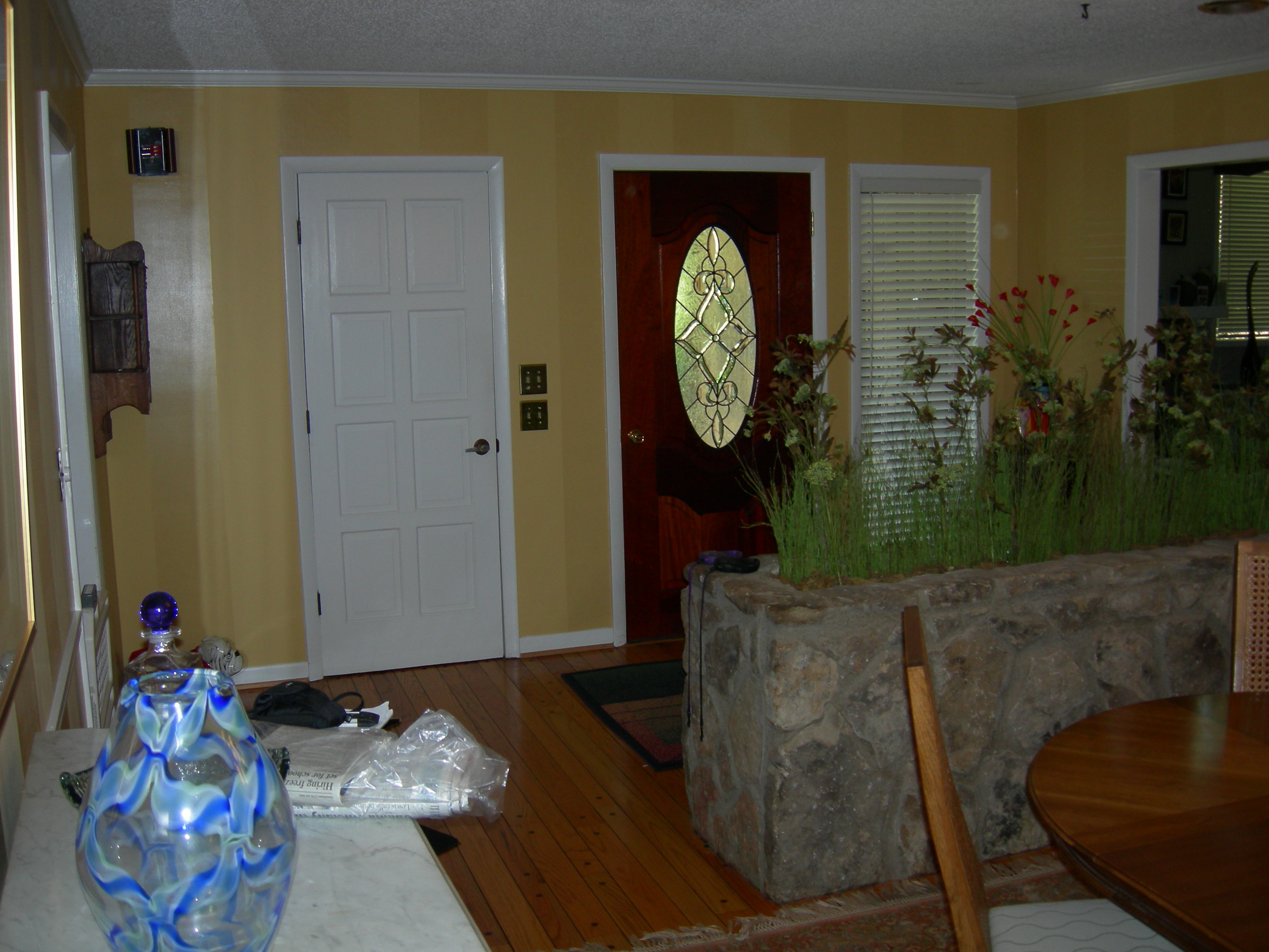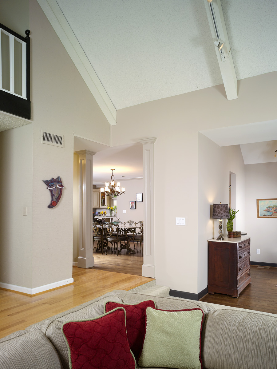 Our clients wanted to achieve several goals with this whole home remodel. They had a front stoop foundation leak problem that needed to be fixed. They also wanted to eliminate the stippled ceilings, add a family room open to the kitchen, and a custom created location to display a beautiful glass sculpture.