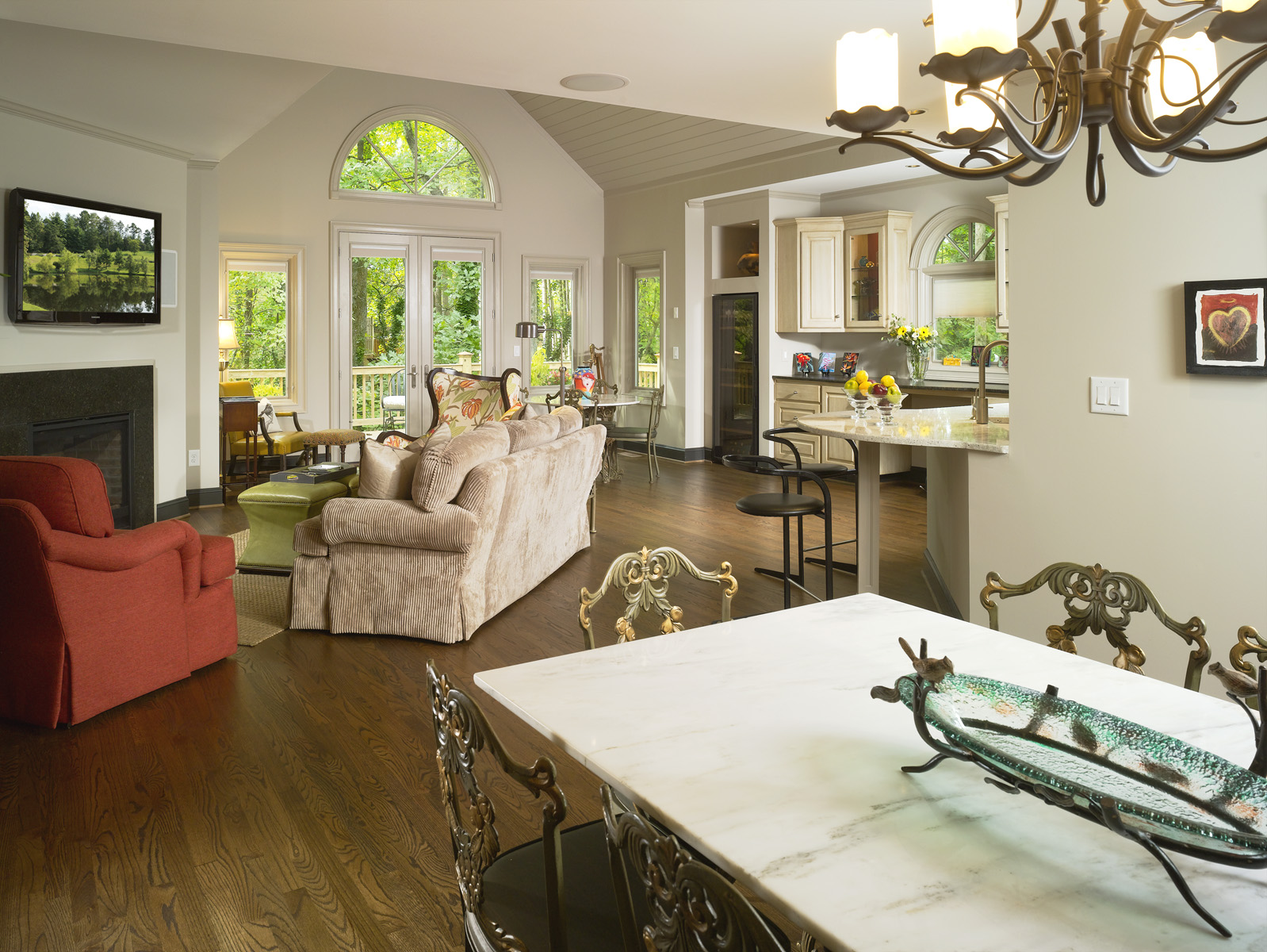 The remodeled entry now invites guests into the living room. We added a family room that encompasses a media area, a game table, and a wine buffet.