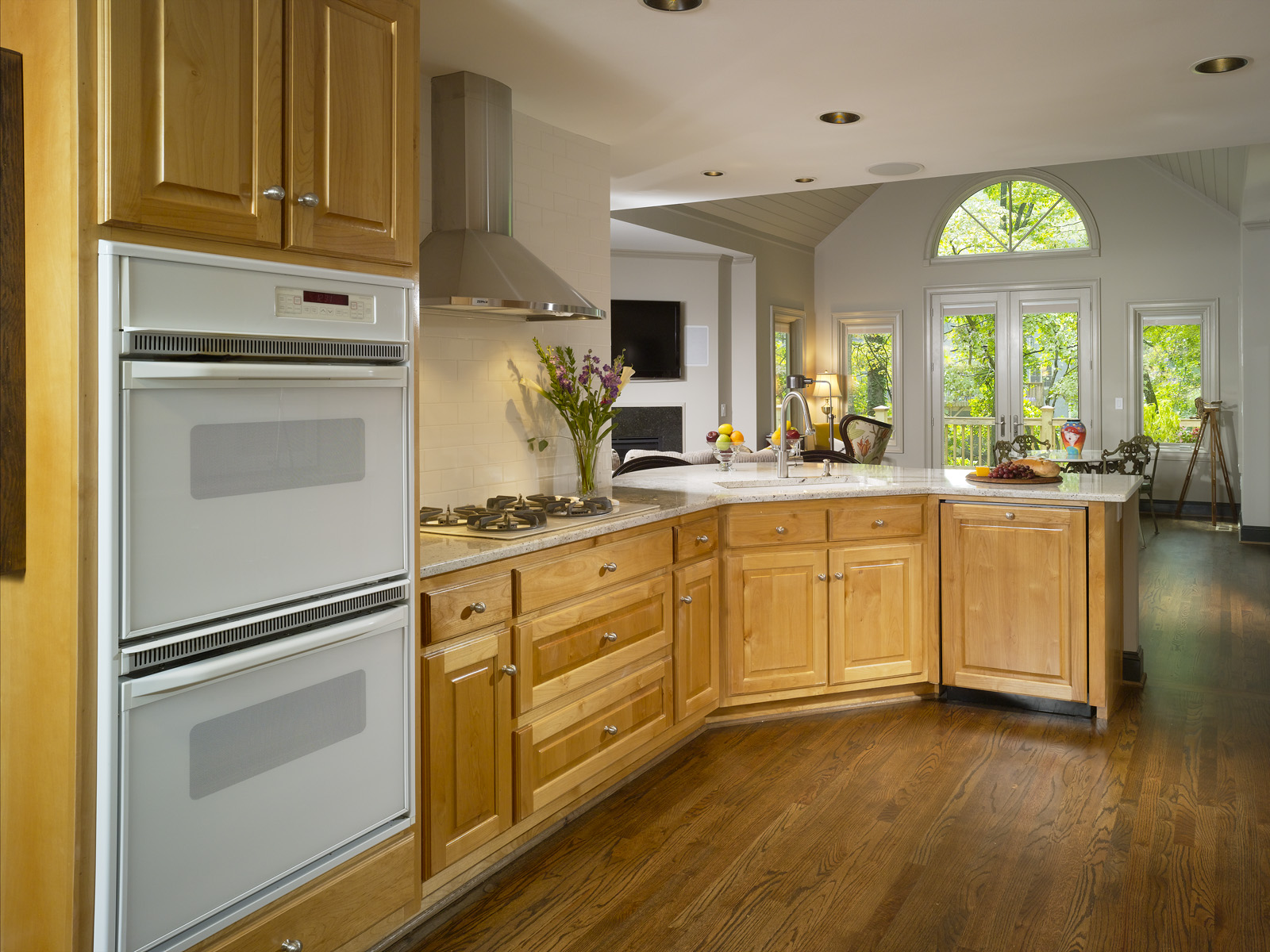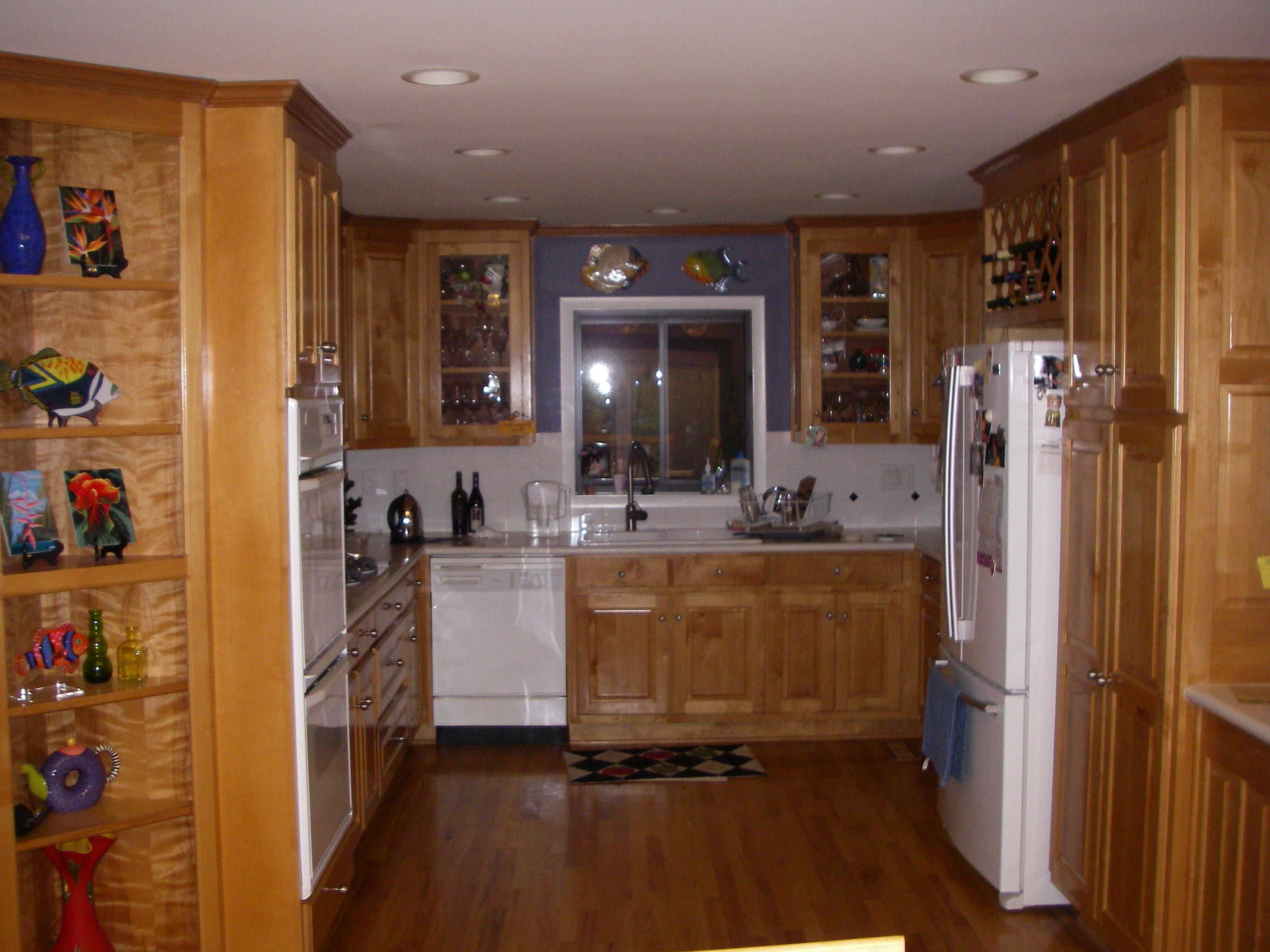 In the kitchen, we built a pantry from a garage niche, which created enough storage to need fewer cabinets and allowed for a more open layout. The existing cabinets were reused in the kitchen and buffet. Function, cost and creativity were our accomplished goals.