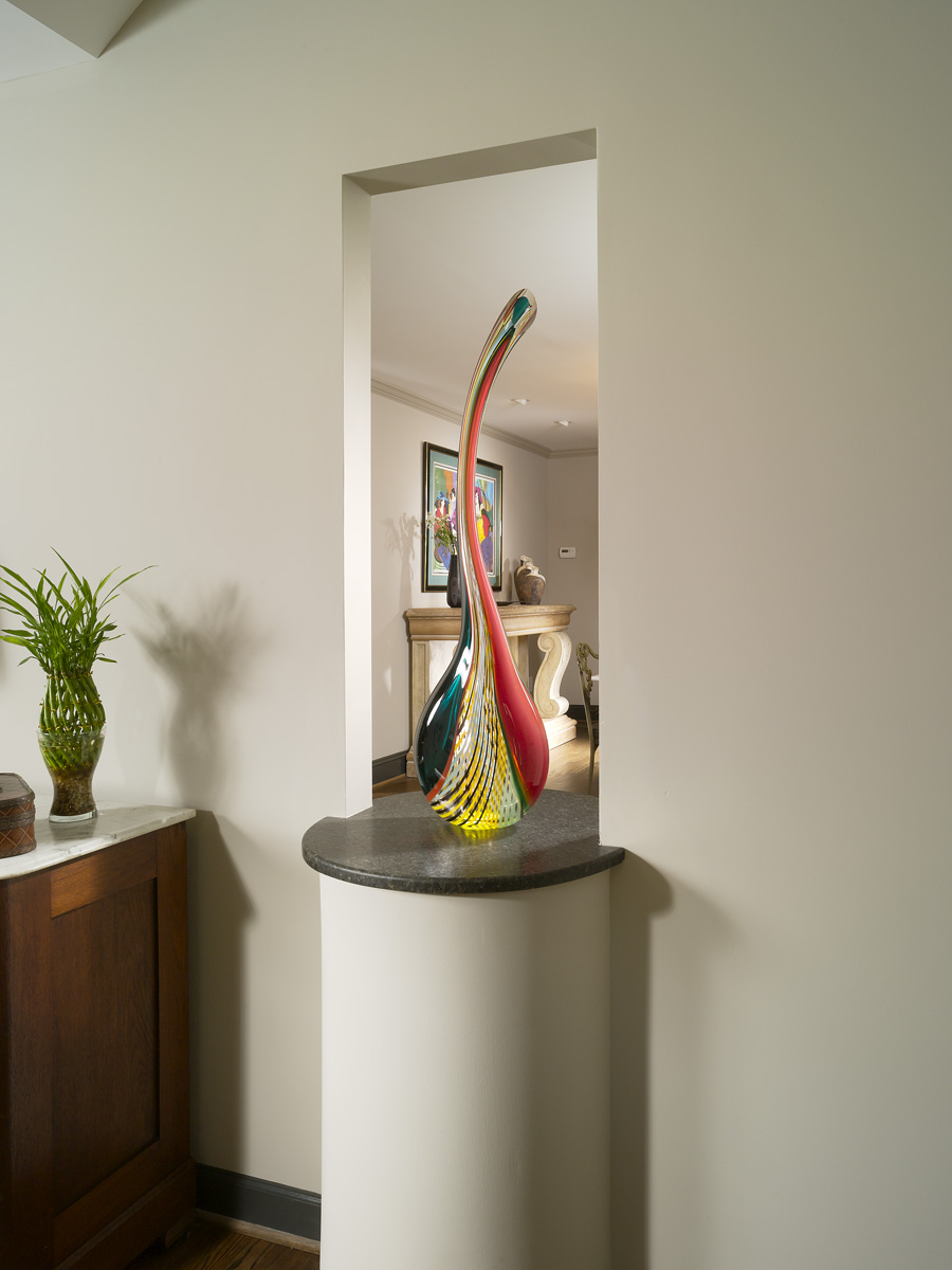 By creating a functional, exciting new front entry, we solved both the water and aesthetics issues. The entry has a properly water proofed foundation and a see-through location for the glass sculpture.