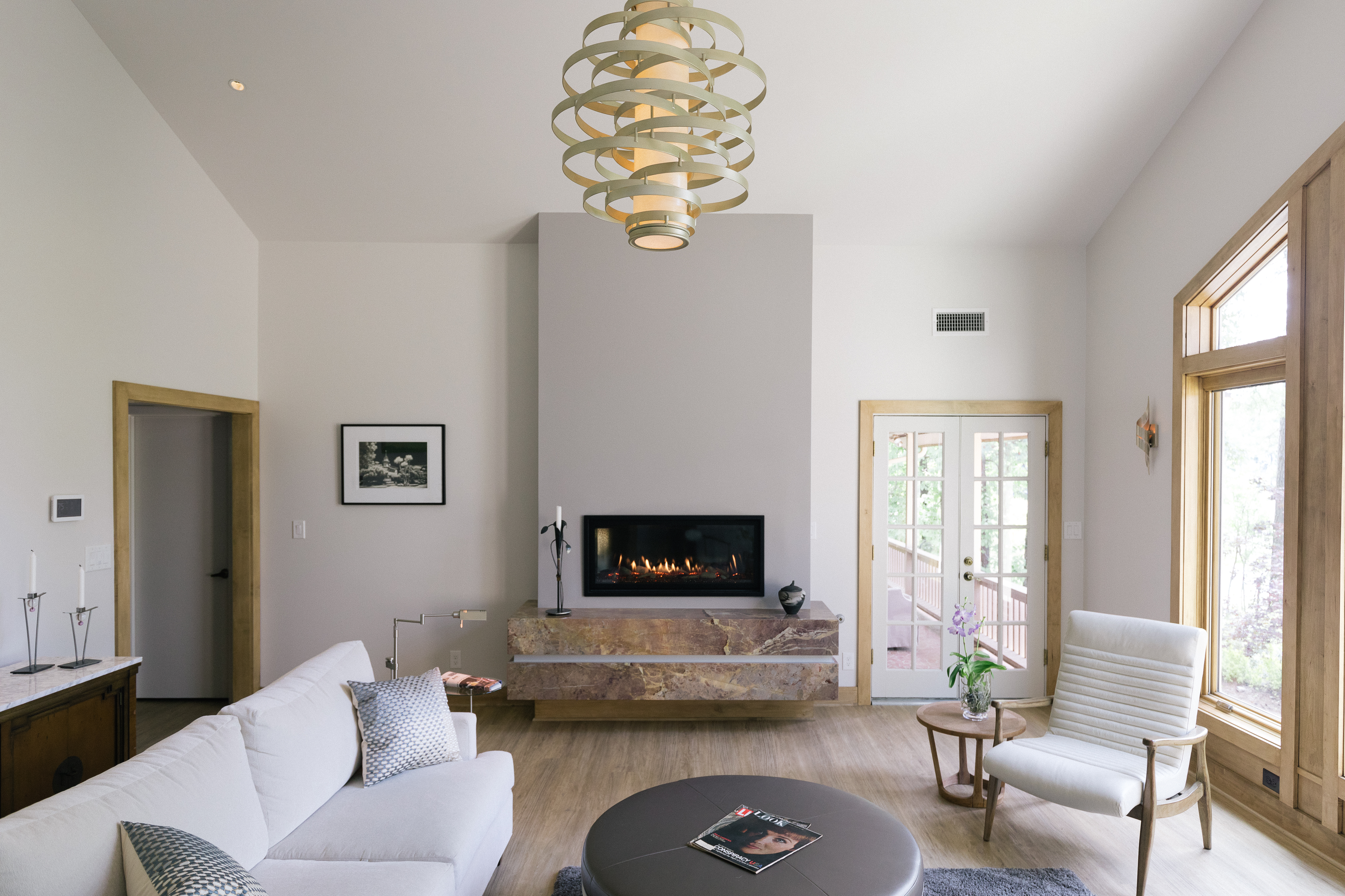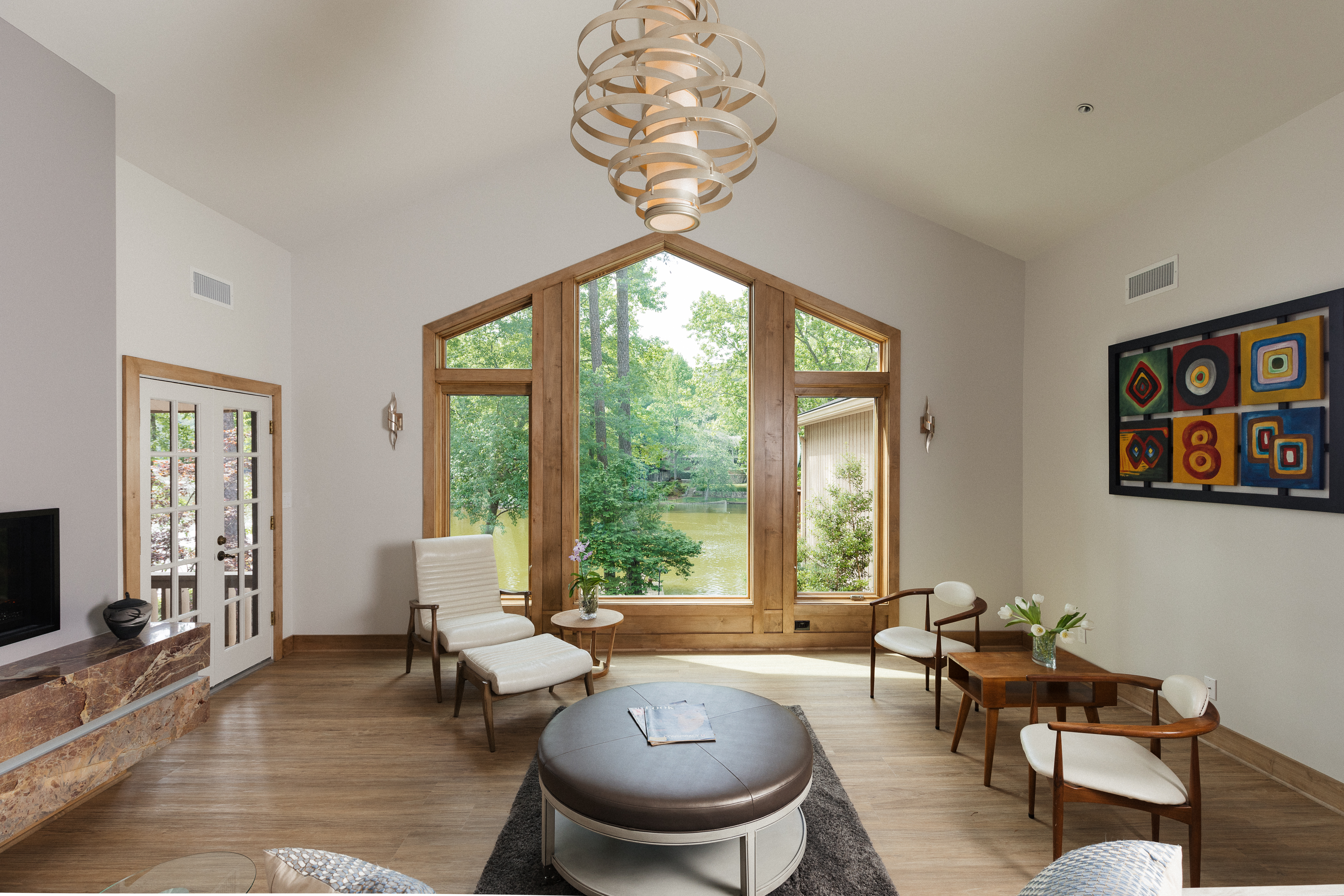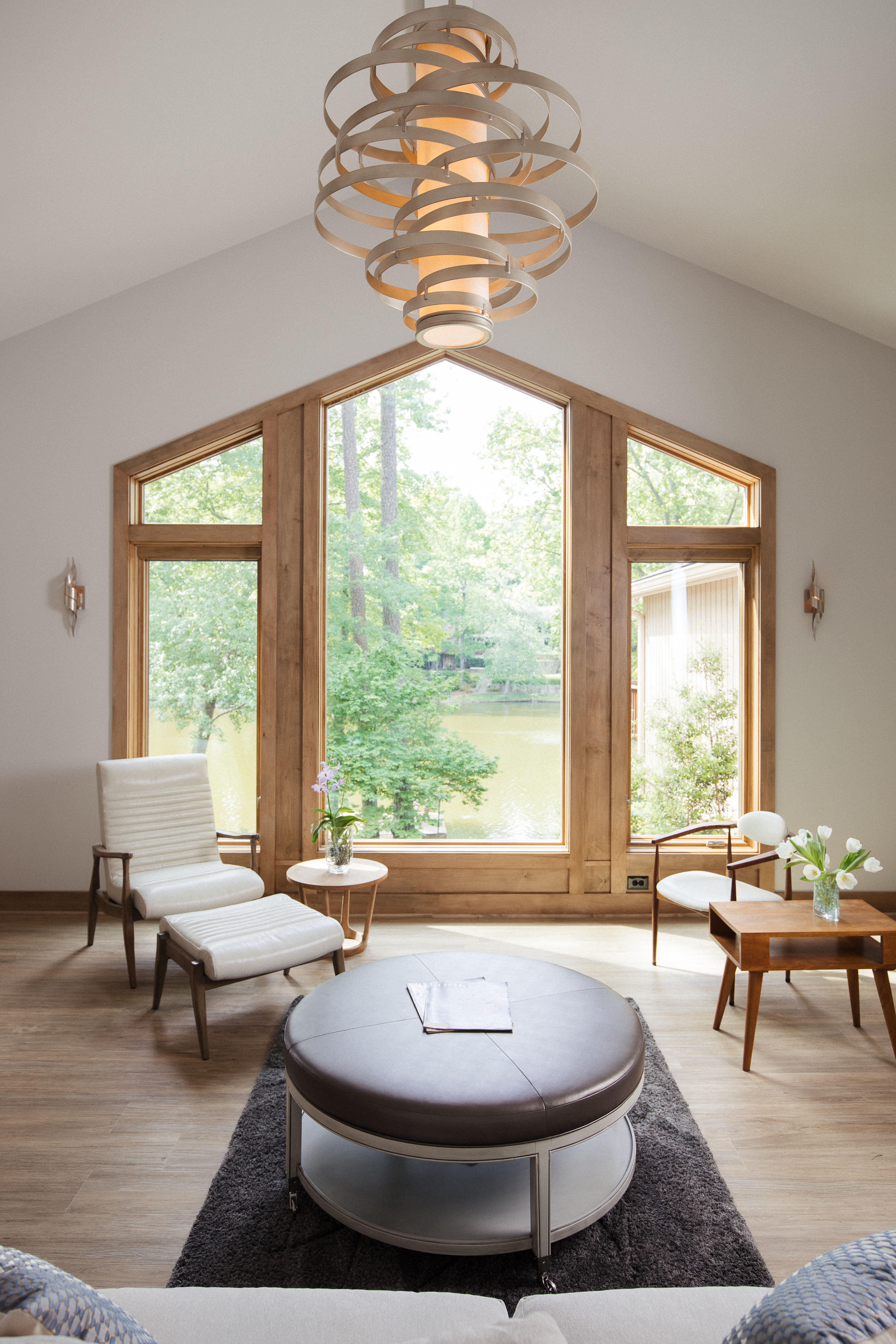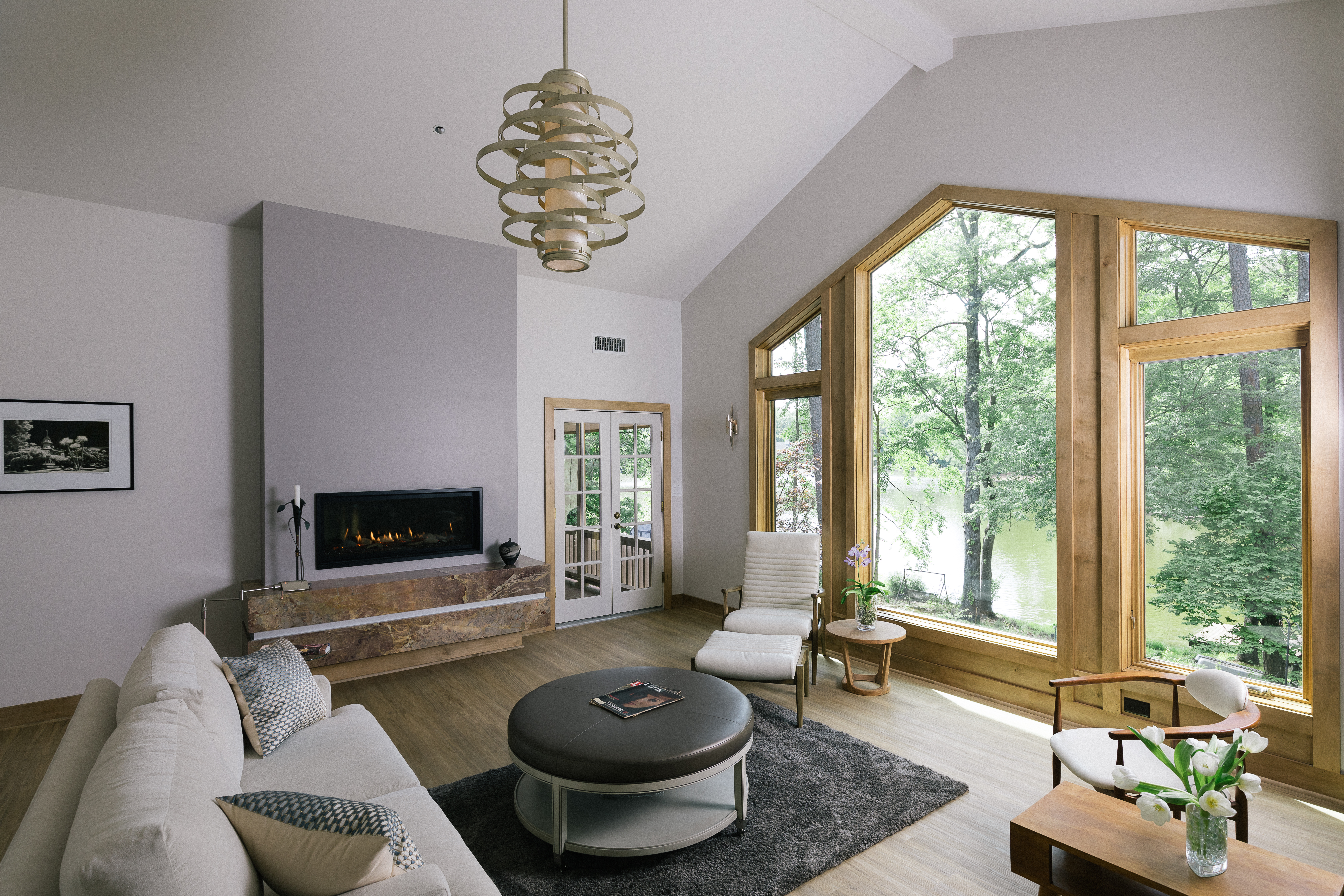 Finally, we updated the room’s aesthetics with a pleasing modern style. We created a simple and clean look that featured the view of the lake and the strikingly unique fireplace. The effect is stunning. Sometimes less is more, and that is certainly true with this room.