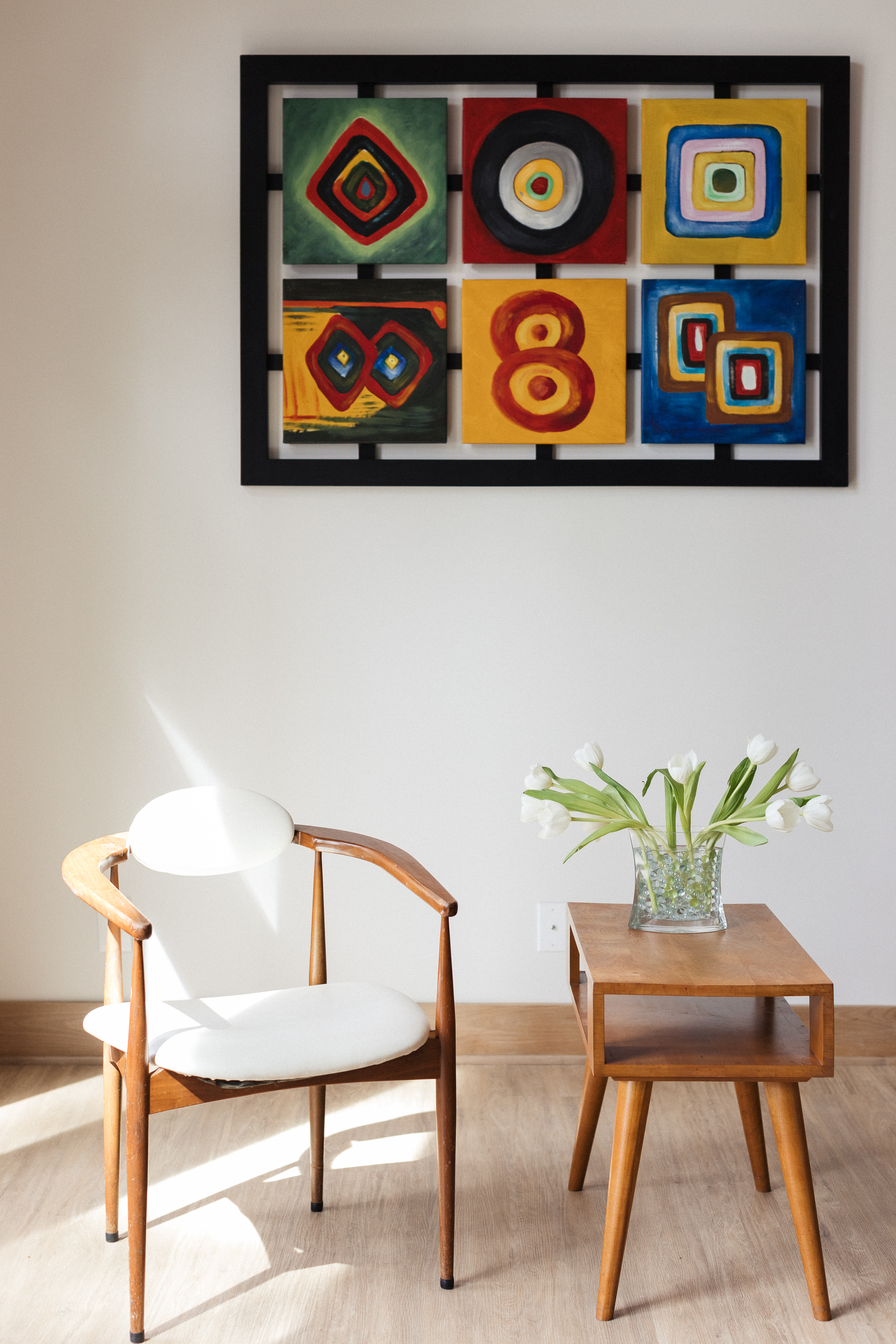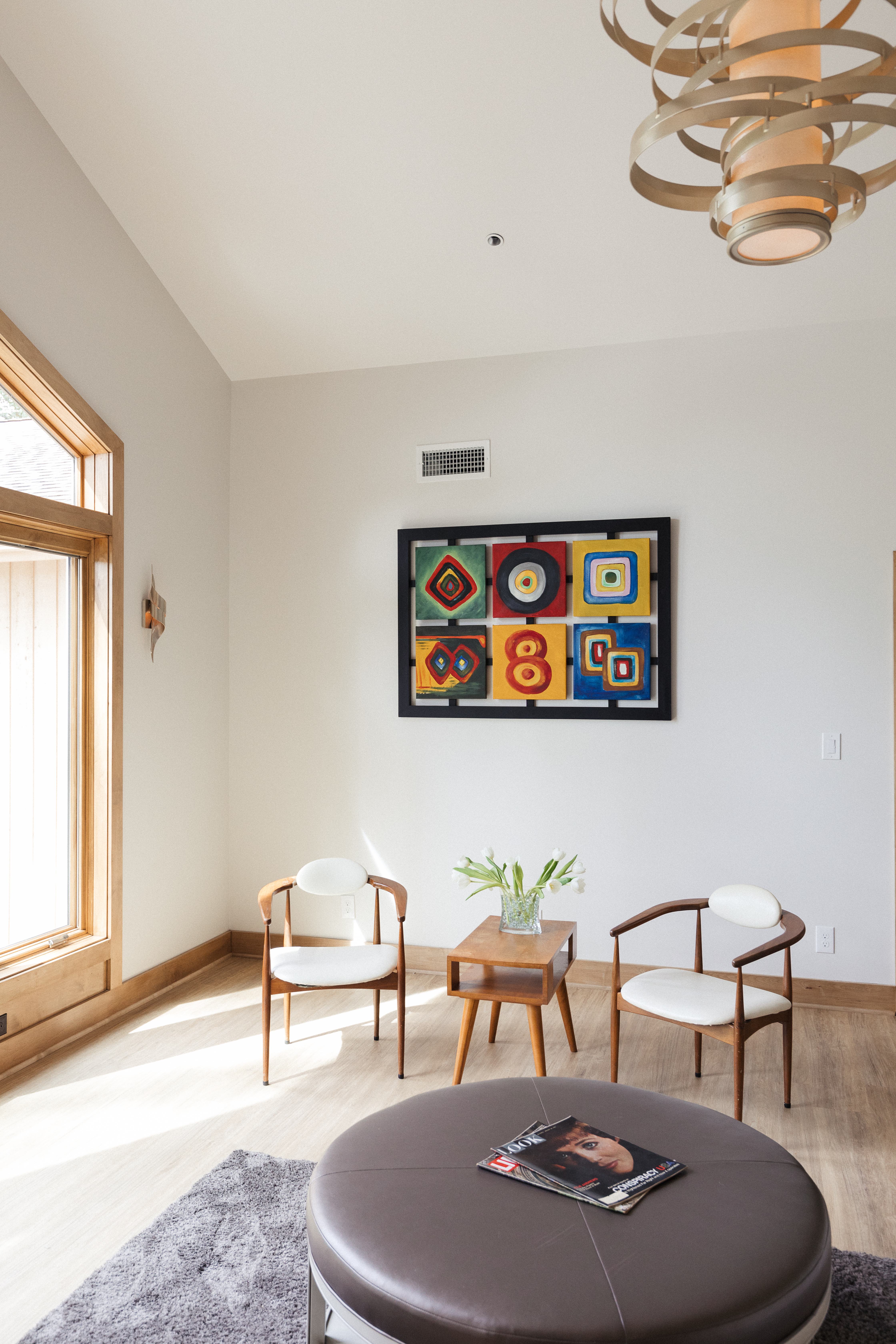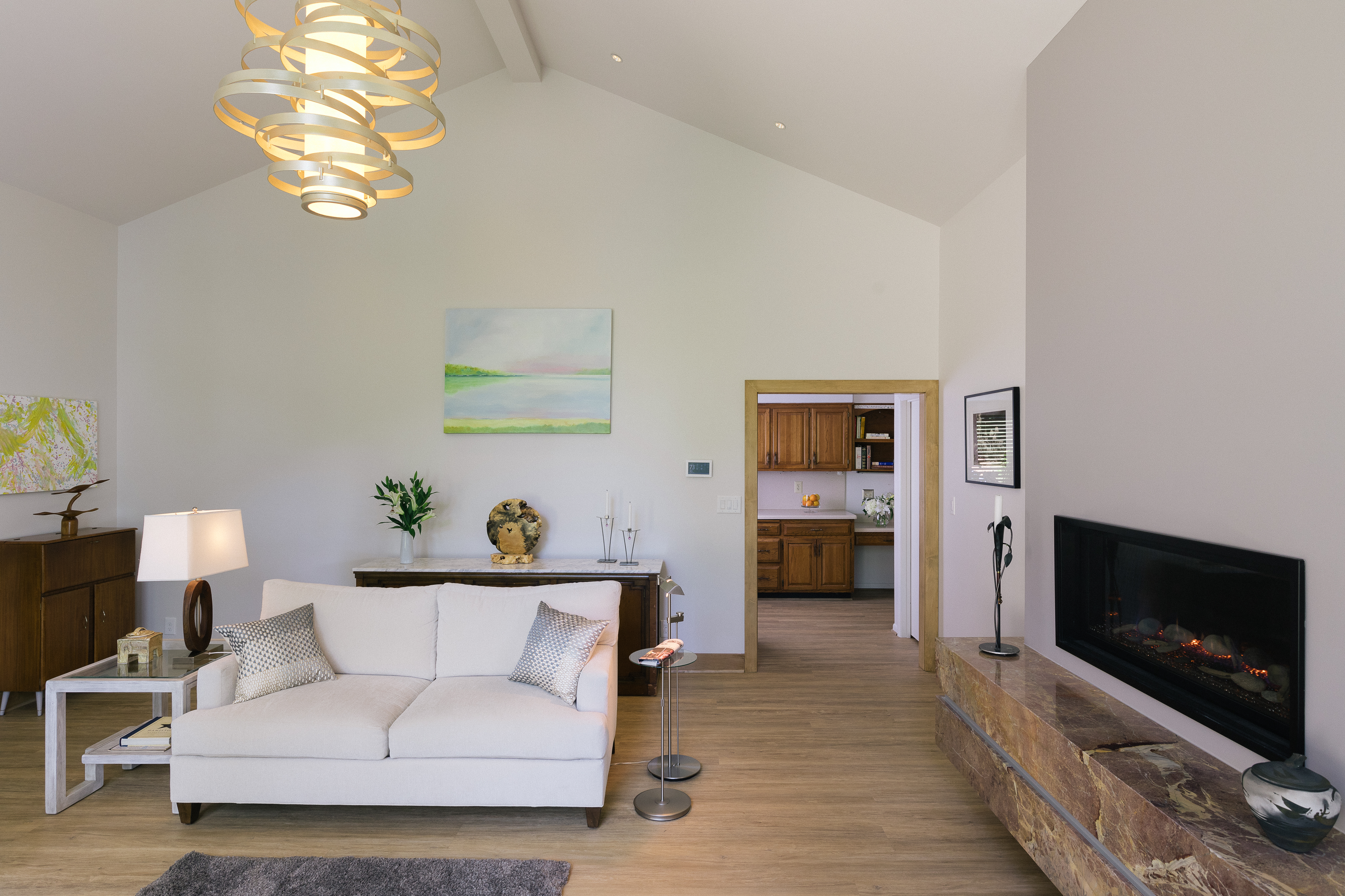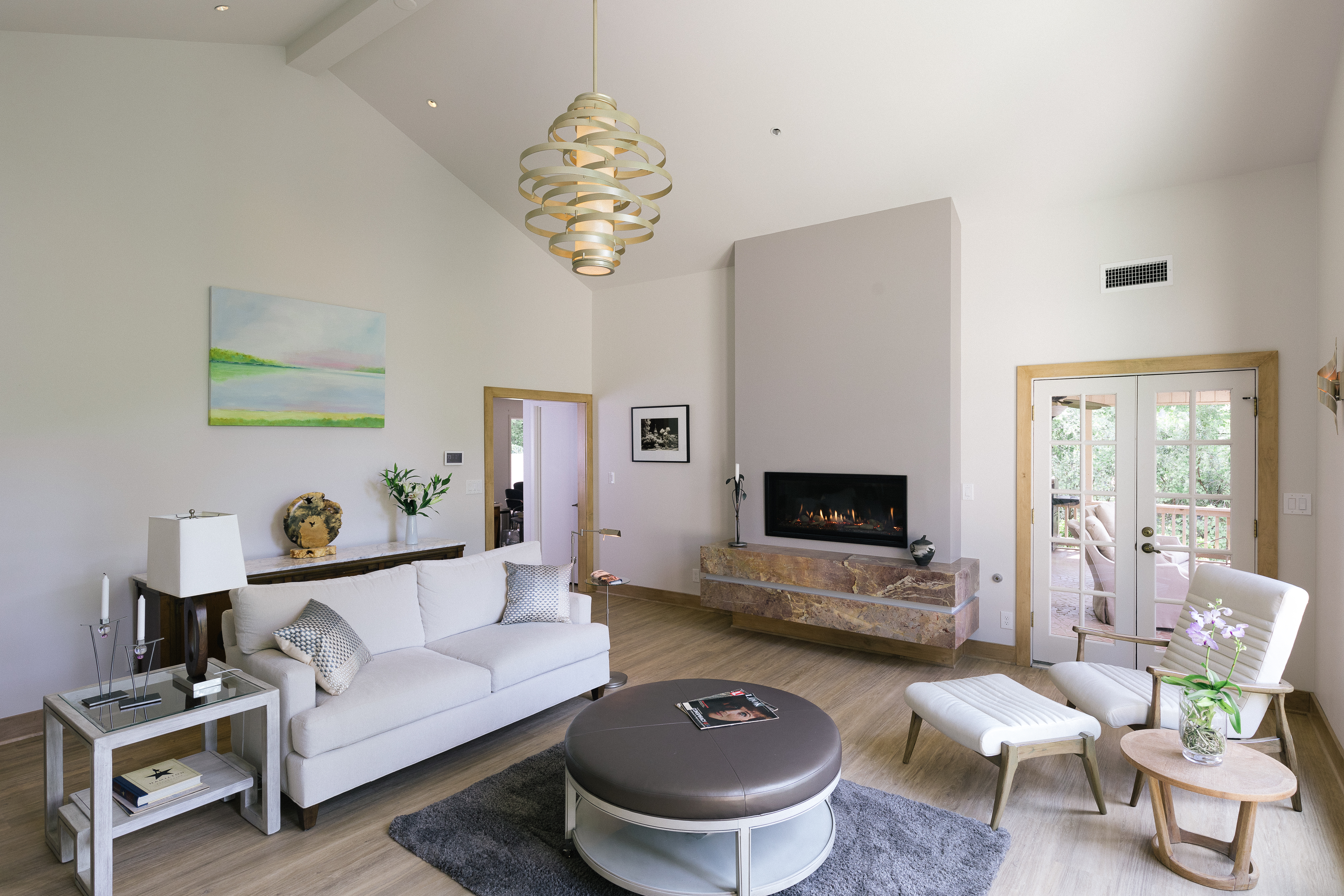 Finally, we updated the room’s aesthetics with a pleasing modern style. We created a simple and clean look that featured the view of the lake and the strikingly unique fireplace. The effect is stunning. Sometimes less is more, and that is certainly true with this room.