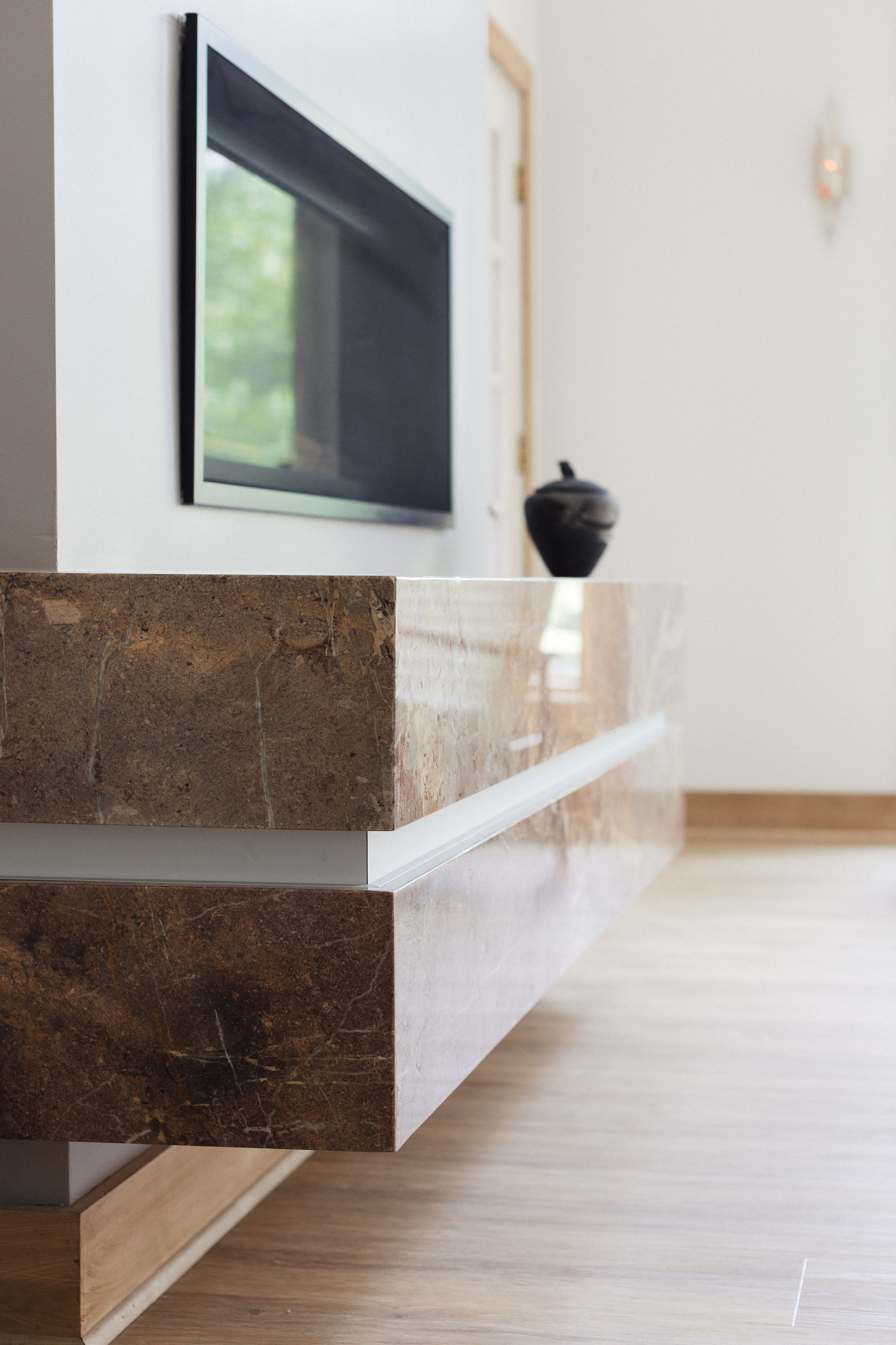 - After: The new hearth, cantilevered on three sides and covered with marble.