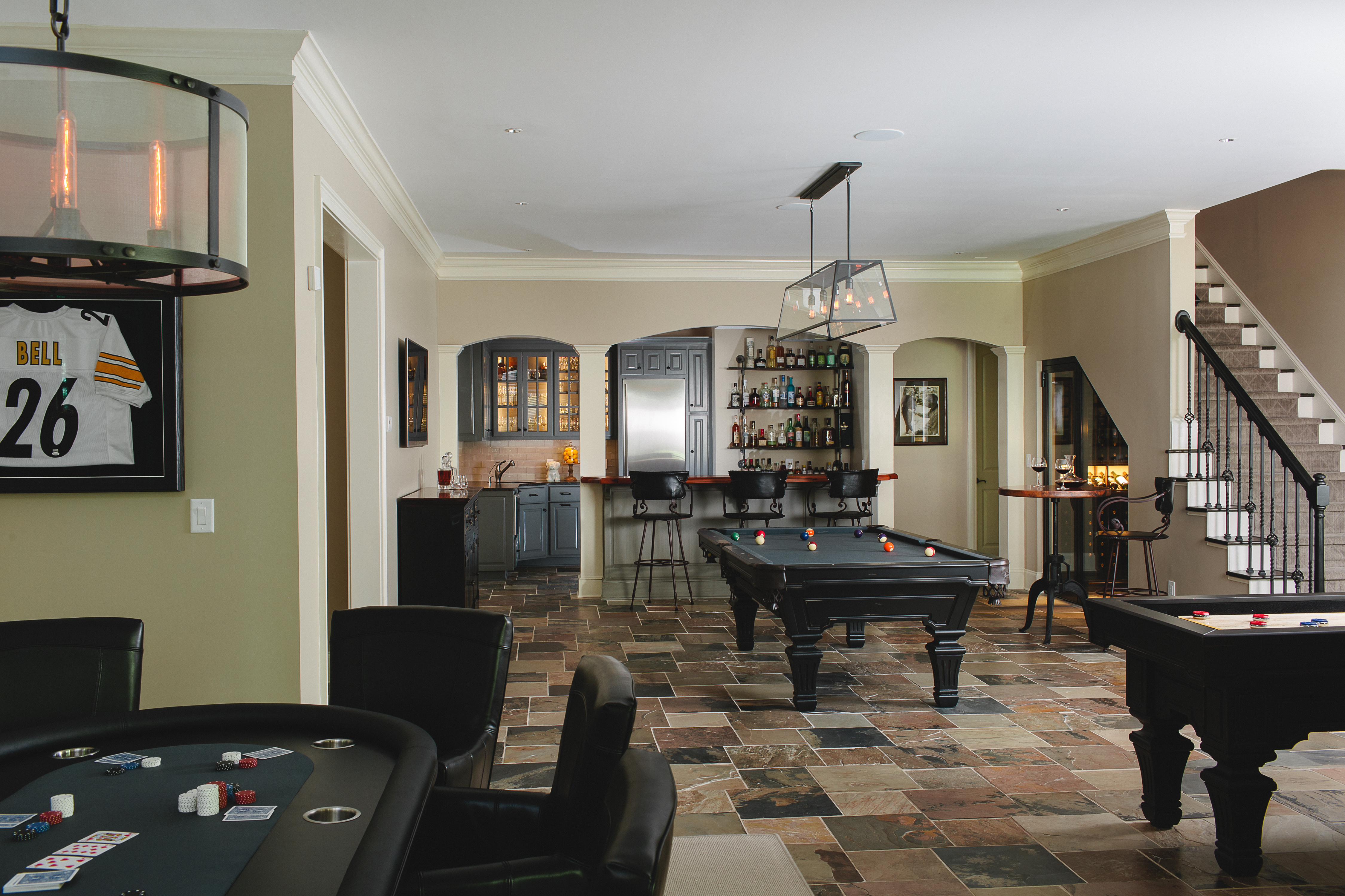 Our clients wanted to update their little-used basement into an entertaining area complete with a wine cellar, game tables, and a fireplace. They also wanted to update their existing terrace level kitchen.