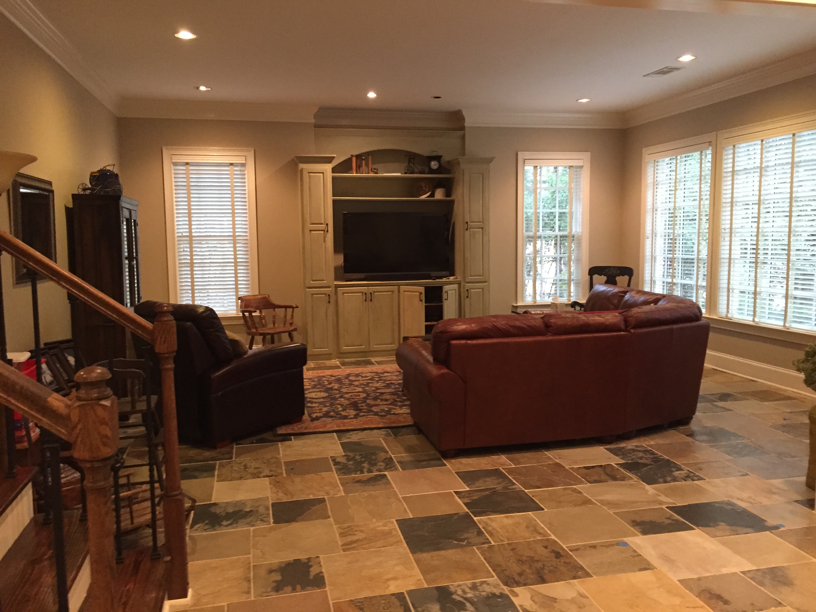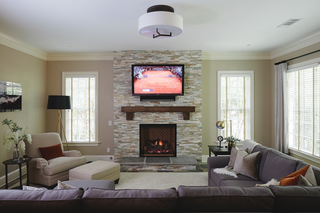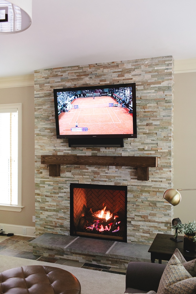 Originally, this space had no fireplace. We installed a fireplace box and used stone cut into ledger tiles to create a fireplace.